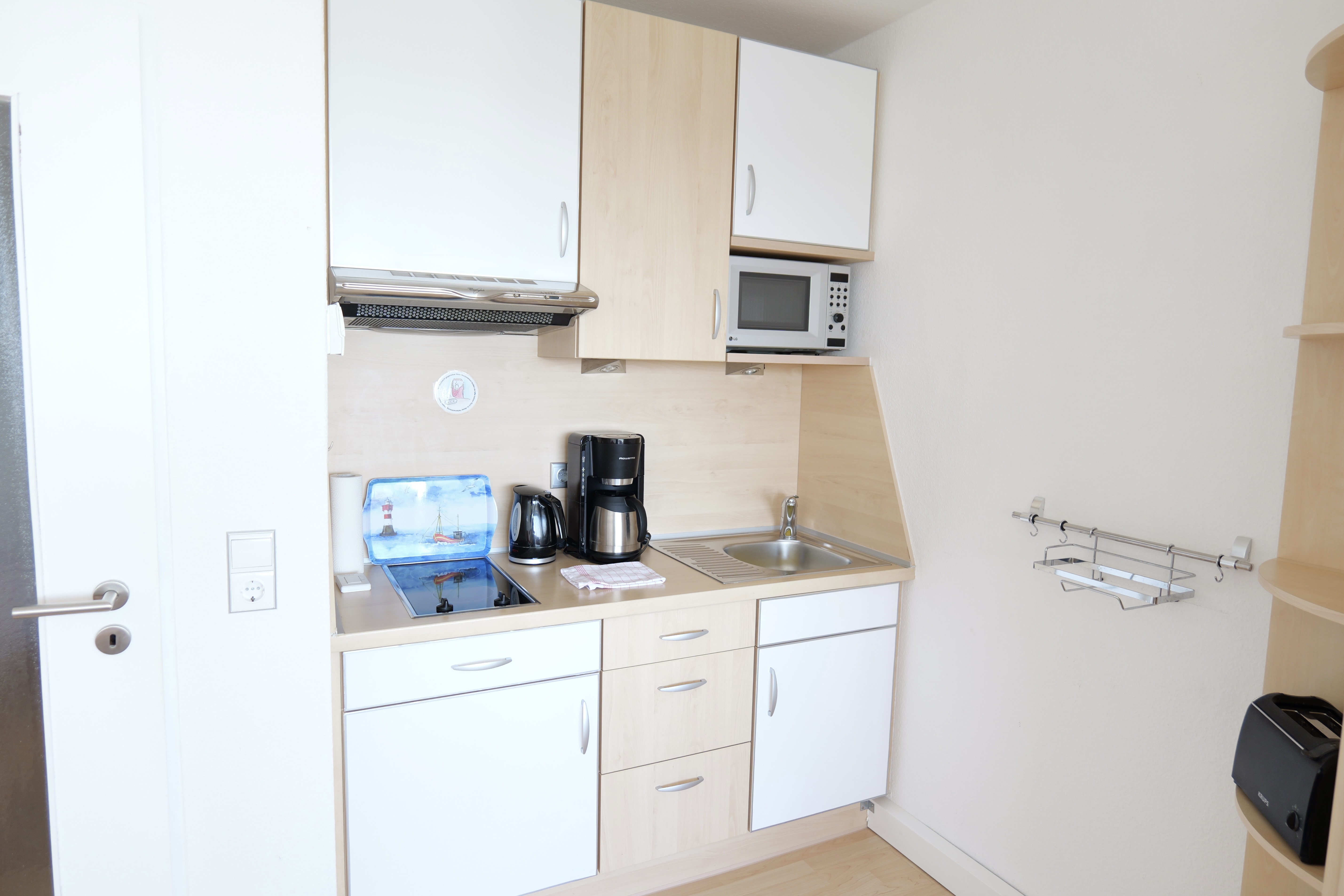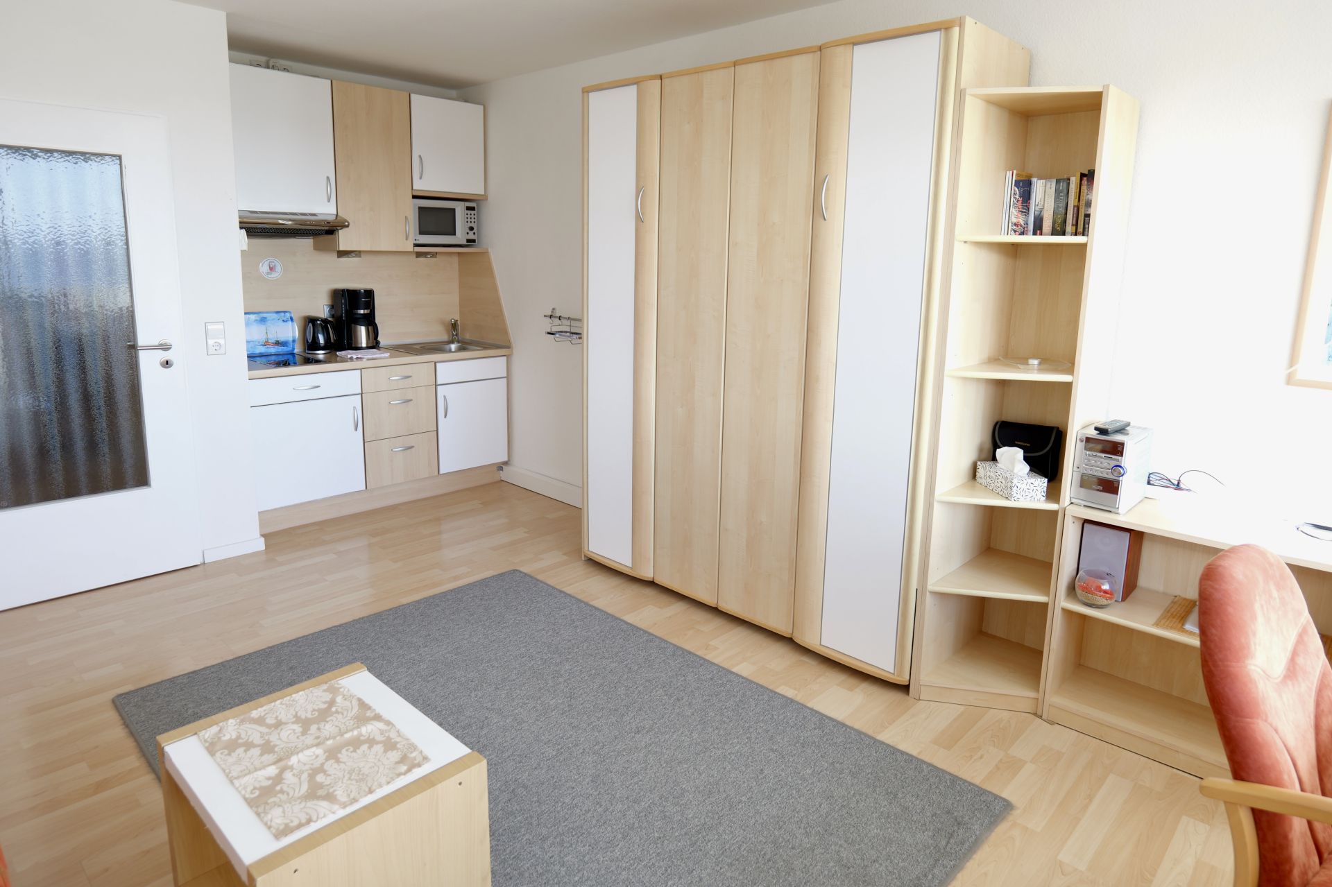 Die gemütliche eingerichtete und gut durchdachte 36-m²-Wohnung befindet sich im vierten Stock und ist bequem mit einem Aufzug zu erreichen. Sie bietet Platz für zwei Personen und verbindet Wohn- und Schlafbereich in einem offenen, hellen Raum. Die integrierte Küchenzeile ist vollständig ausgestattet mit allen notwendigen Küchenutensilien. Der Essbereich ist ideal, um gemeinsame Mahlzeiten zu genießen und dabei die vorbeifahrenden Schiffe zu beobachten. Das Schrankbett (160x200), Sofa und bequeme Stuhlsessel und ein TV sorgen für Behaglichkeit, wobei sich das Fernsehprogramm auch ganz bequem aus dem Bett verfolgen lässt.