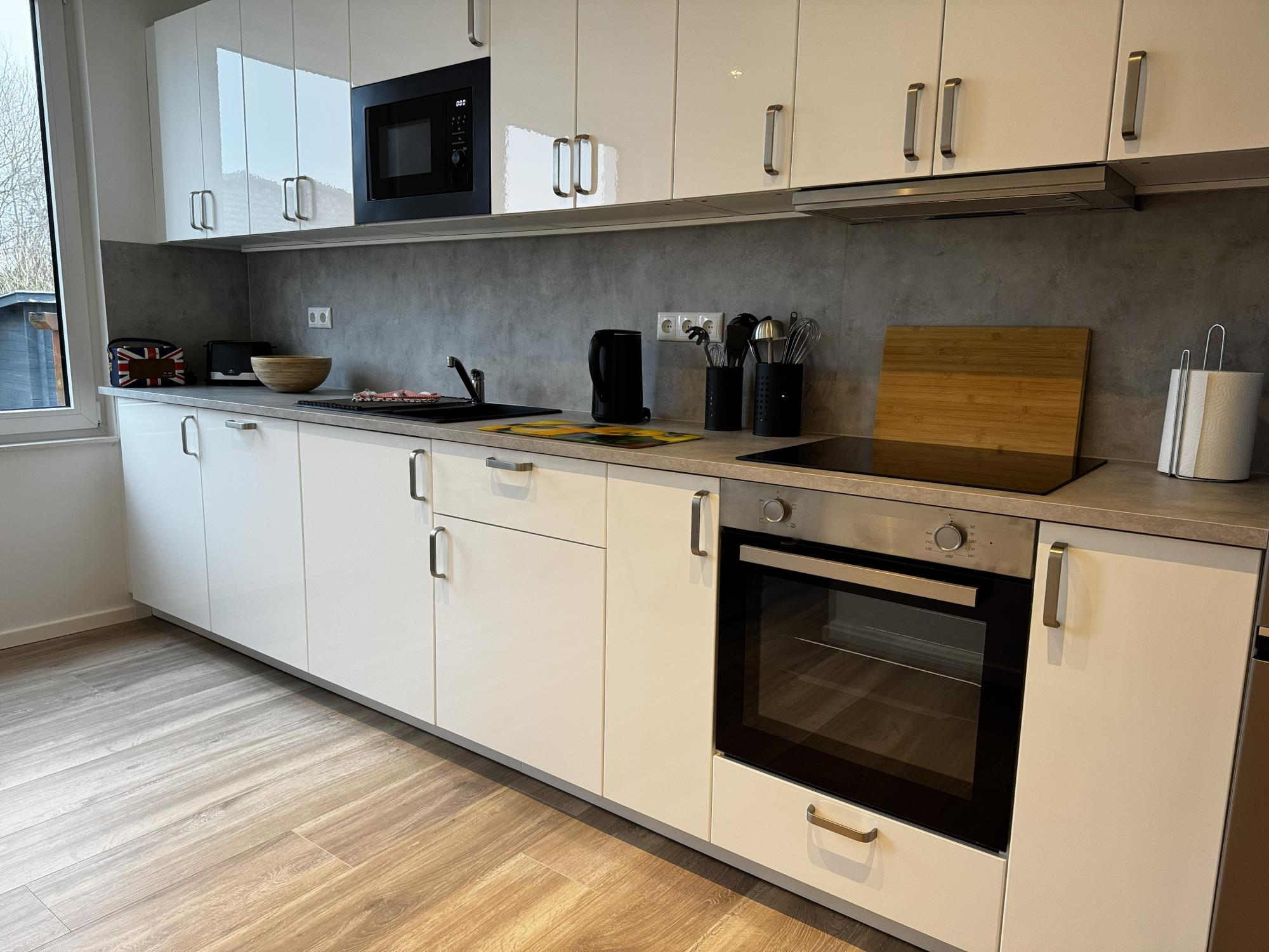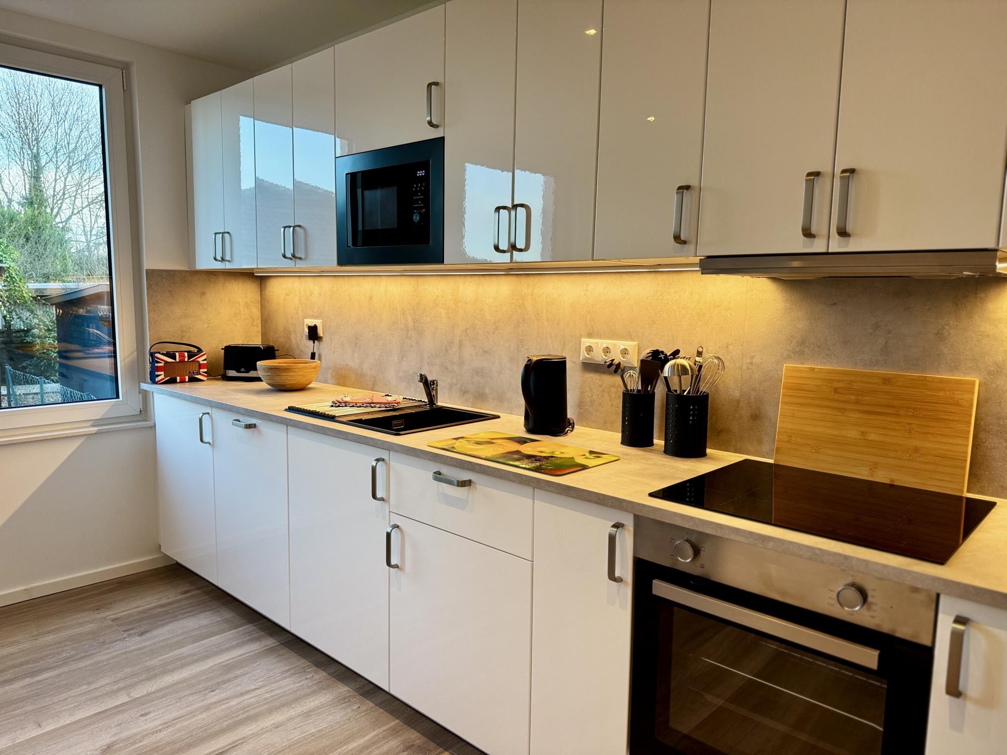 Die moderne, voll ausgestattete Küchenzeile bietet alles für Ihre Selbstversorgung: Backofen, Kühlschrank mit Gefrierfach, Mikrowelle, Kaffeemaschine, Wasserkocher sowie Kochgeschirr, Besteck und Geschirr.