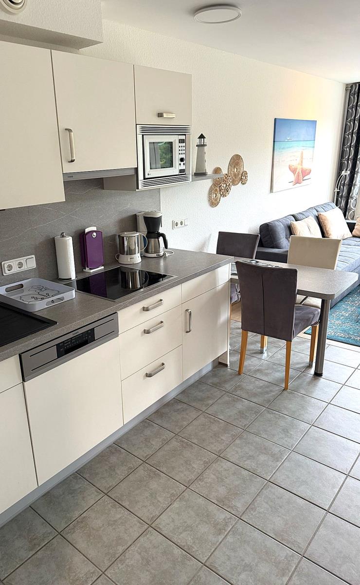 Der helle Wohnraum bietet eine bequeme, neue Schlafcouch, sowie eine voll ausgestattete Küchenzeile mit Geschirrspüler, Herd, Mikrowelle und weiteren Küchengeräten. Zur Unterhaltung stehen Kabel-TV und eine Stereo-Anlage zur Verfügung. Kostenloses WLAN ist ebenfalls vorhanden (keine zugesicherte Eigenschaft).