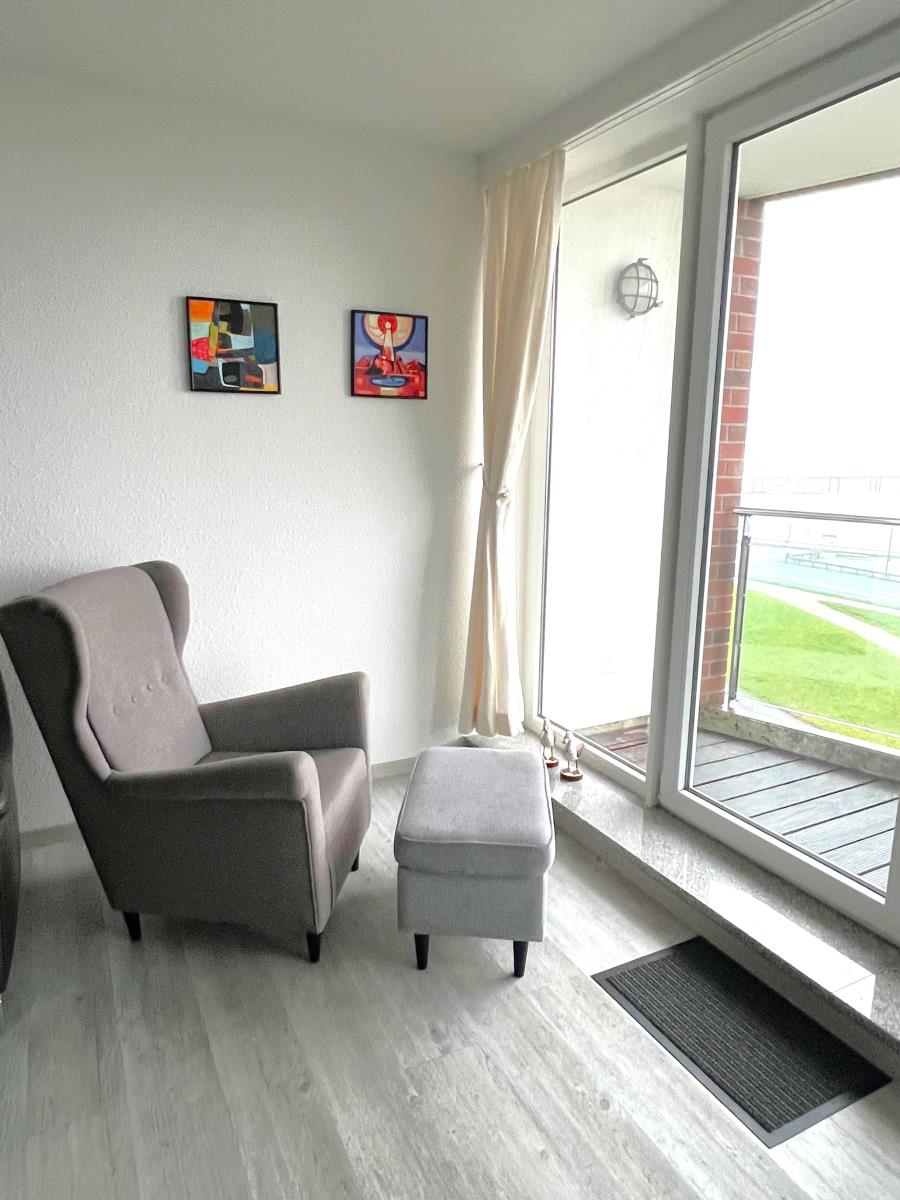 Genießen Sie den atemberaubenden Blick auf die Elbemündung vom großzügigen Balkon aus, wo Sie bei einem Glas Wein die vorbeifahrenden Schiffe beobachten können. Das Doppelschlafzimmer ist mit äußerst bequemen Betten( 2 x 90 x 200) ausgestattet und sorgt für erholsame Nächte. Ein separater Raum dient als praktisches Schrankzimmer, während das Schlafsofa im Wohnbereich eine zusätzliche Schlafgelegenheit für zwei Personen bietet.
