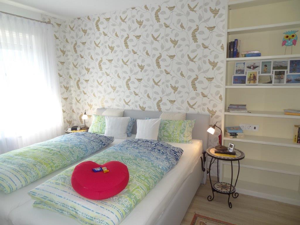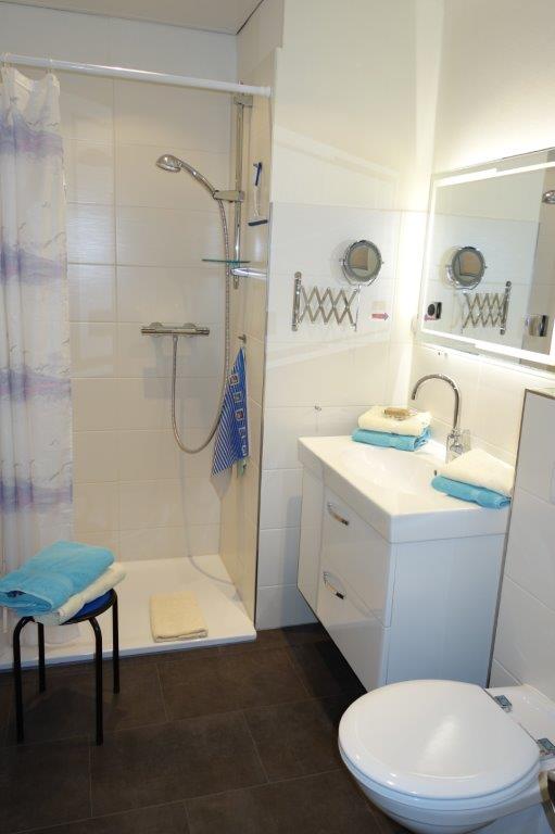Das Schlafzimmer (ca. 11 m²) hat ein komfortables Doppelbett (200 x 180) mit elektrischer Verstellung sowie einen Flachbild-TV und einen Radiowecker. Das Badezimmer (ca. 6 m²) ist mit einer bodengleichen Dusche und einem Föhn ausgestattet.