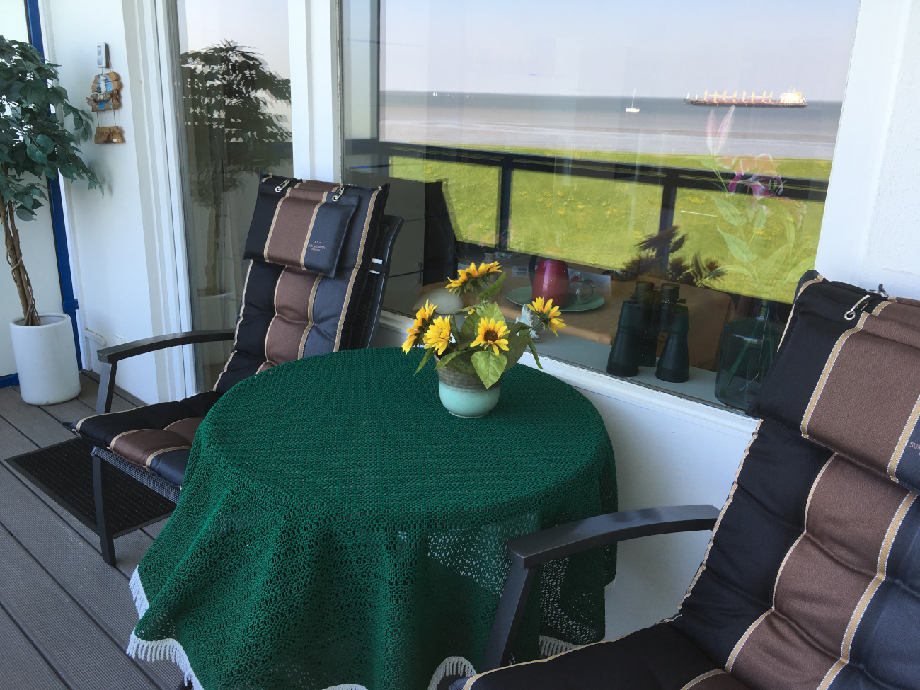 Auf dem geschützten Balkon können Sie in Hochlehnstühlen entspannen und Ihre Mahlzeiten einnehmen. Die Wohnung ist ideal für Langzeiturlauber. Rauchen ist in der Wohnung nicht gestattet.