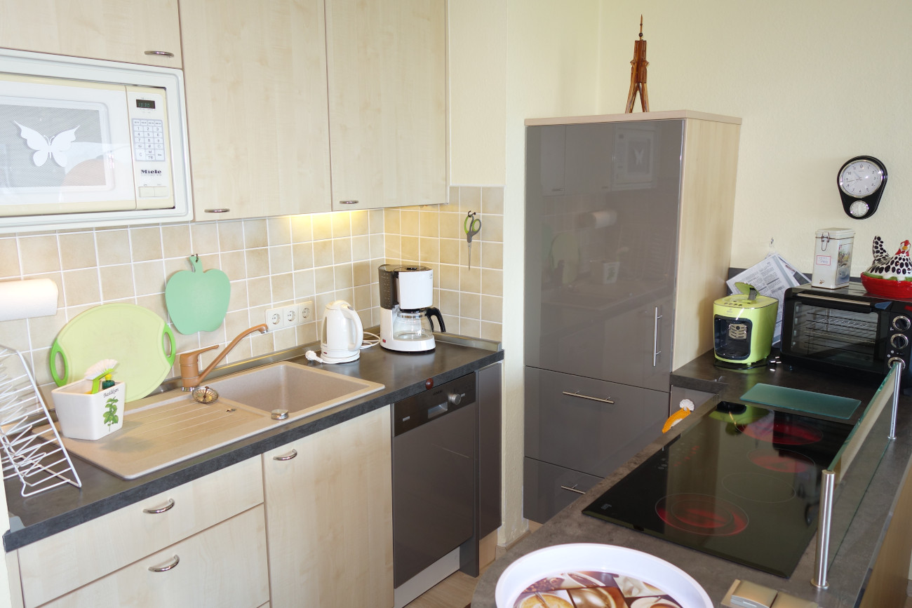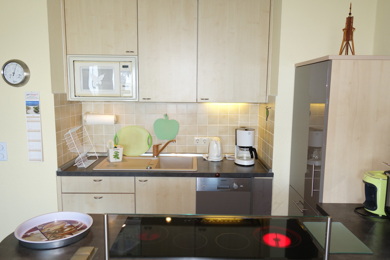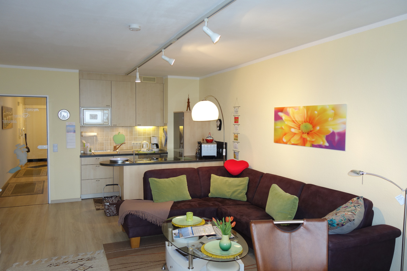 Der Wohn-/Essbereich (ca. 26 m²) ist ausgestattet mit Flachbild-TV, HiFi-Anlage, WLAN-Radio und DVD-Player. Die funktionelle Küche bietet ein Ceranfeld, Mini-Backofen, Kaffeemaschine, Wasserkocher und Geschirrspüler.