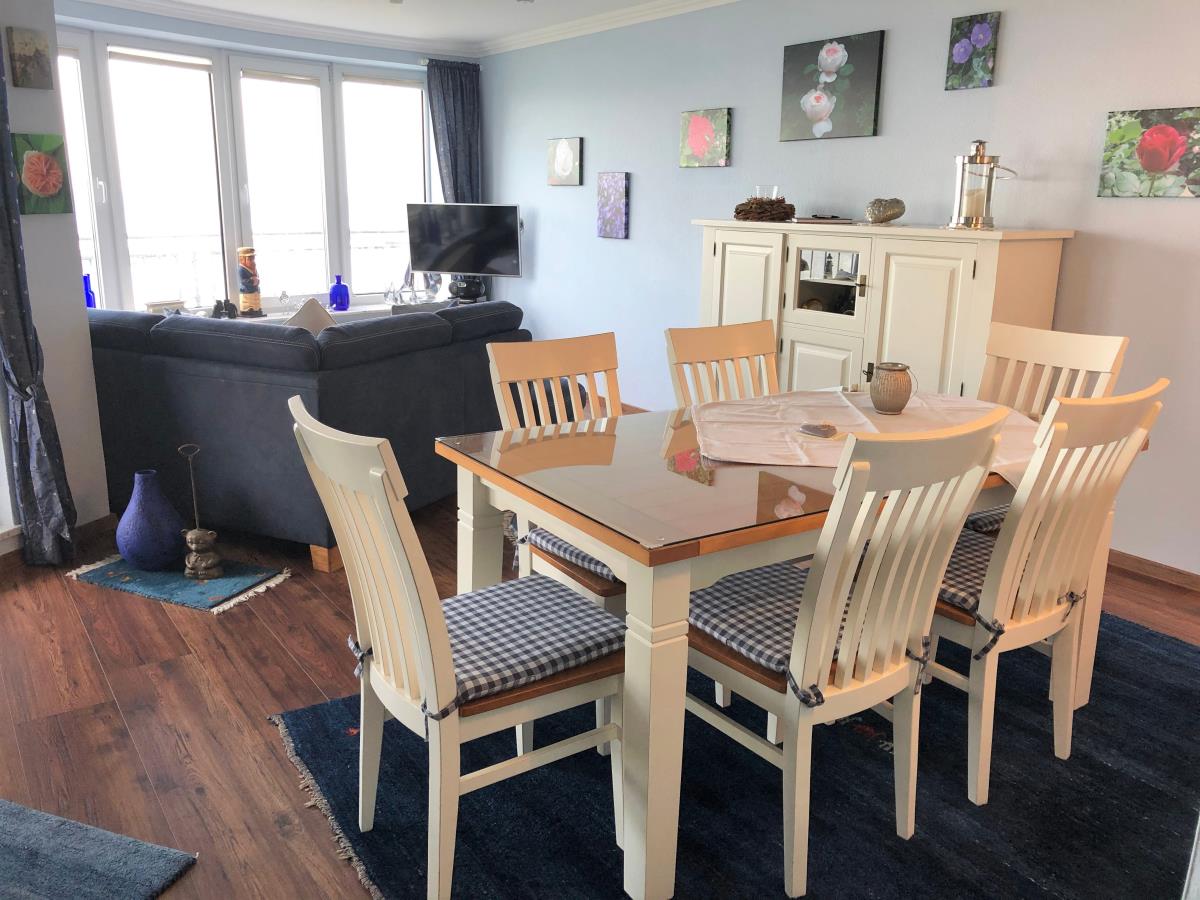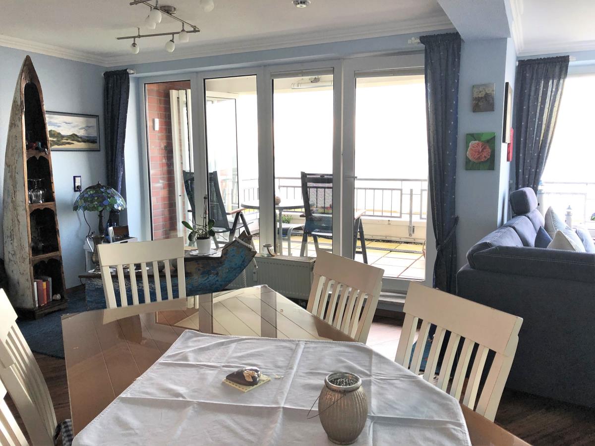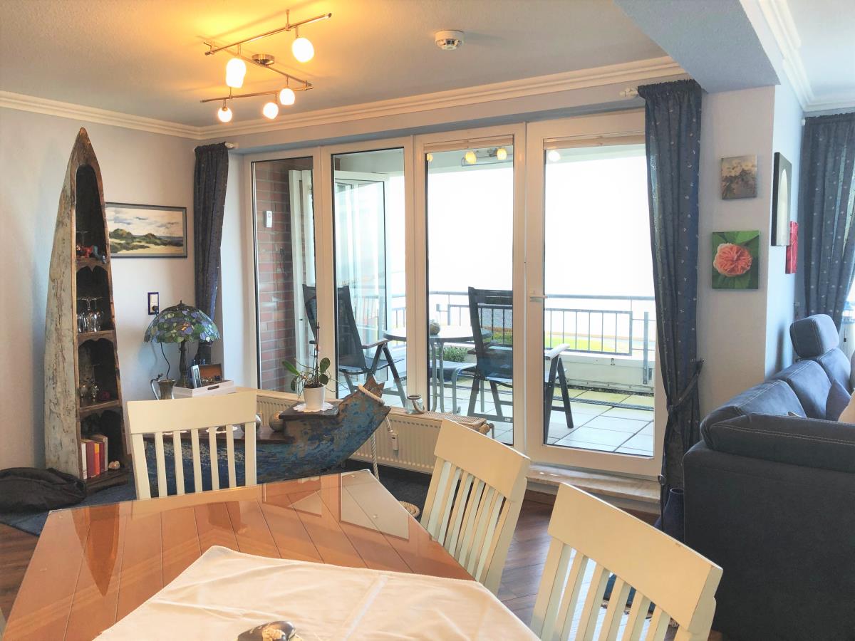 Willkommen in dieser geschmackvollen Ferienwohnung im Haus Seeterrassen, gelegen in der 2. Etage. Der große Balkon bietet Ihnen die Möglichkeit, die frische Nordseeluft und den Blick auf das Meer zu genießen. Mit einer Fläche von rund 79 m² erwartet Sie ein großzügiger Wohnbereich mit integriertem Essplatz, ein Schlafzimmer mit einem komfortablen Doppelbett (2 x 90 x 200 cm) (erhöht) und einem großen Kleiderschrank sowie ein modernes Duschbad mit Regendusche und bodengleichem Zugang.