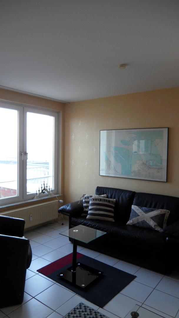 Willkommen in dieser attraktiven Ferienwohnung im Haus Seeterrassen, in der 2. Etage, mit großzügiger, umlaufender Dachterrasse und fantastischer Seesicht auf 90 m². Der helle Wohnbereich mit Essplatz bietet Blick auf den Schifffahrtsweg und ein Sofa, das als Schlafgelegenheit für zwei Personen genutzt werden kann.