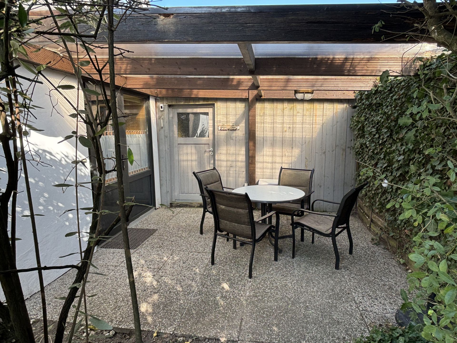 Außerdem befindet sich vor dem Eingang eine große überdachte Terrasse mit Gartenmöbeln und Liegen.