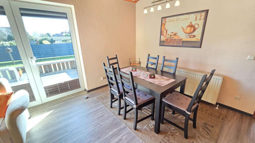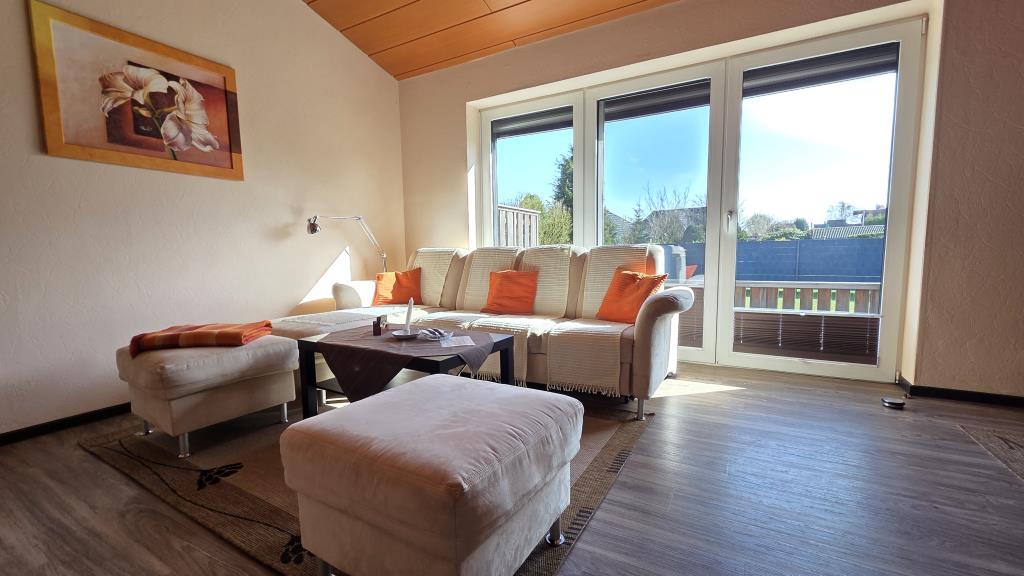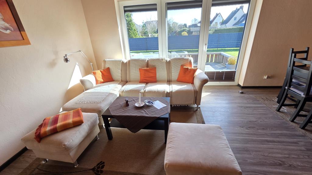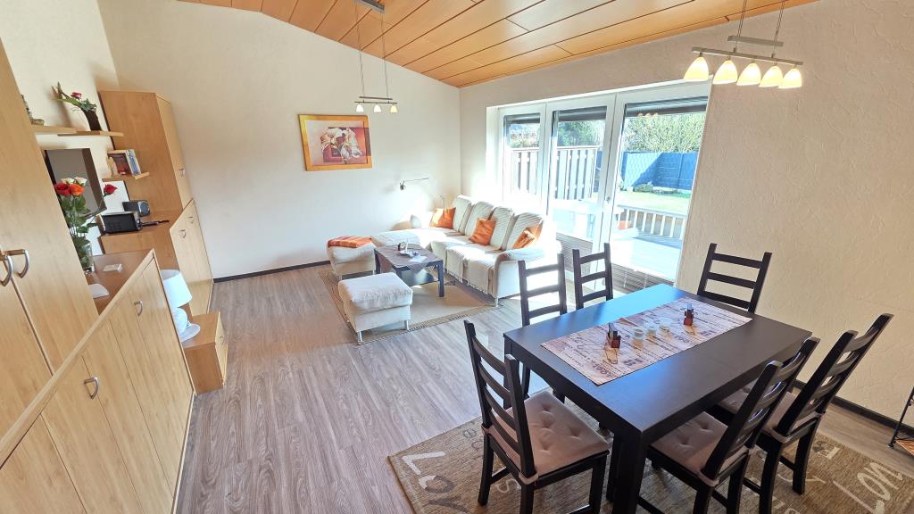 Der helle Wohnbereich ist mit einer Couchgarnitur, Esstisch und direktem Zugang zur Terrasse ausgestattet. Hier können Sie den Tag bei einer Tasse Kaffee oder einem Glas Wein ausklingen lassen.