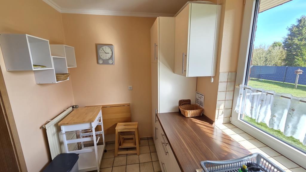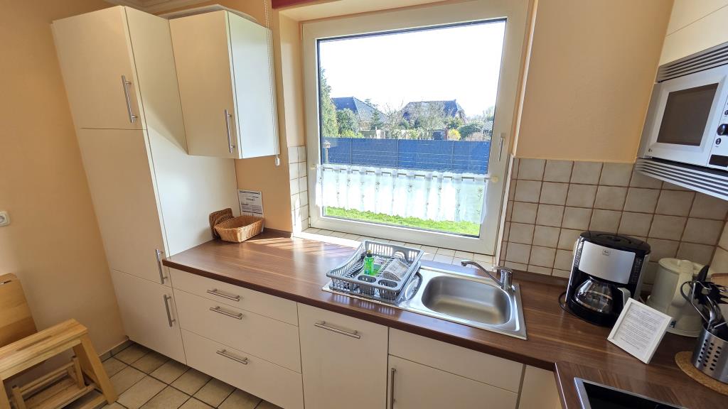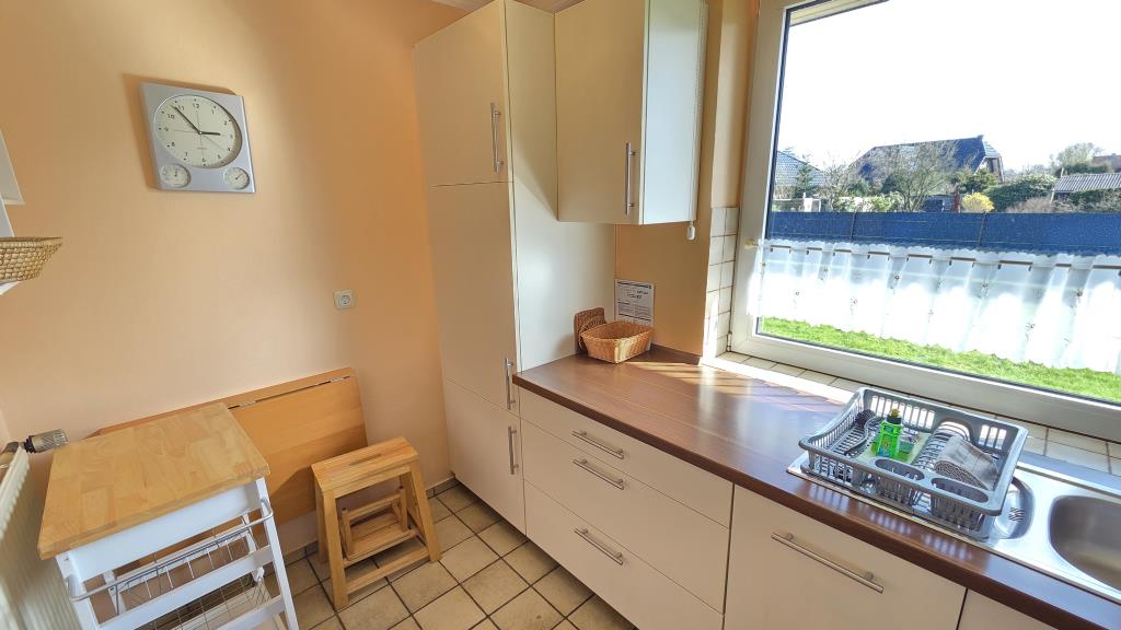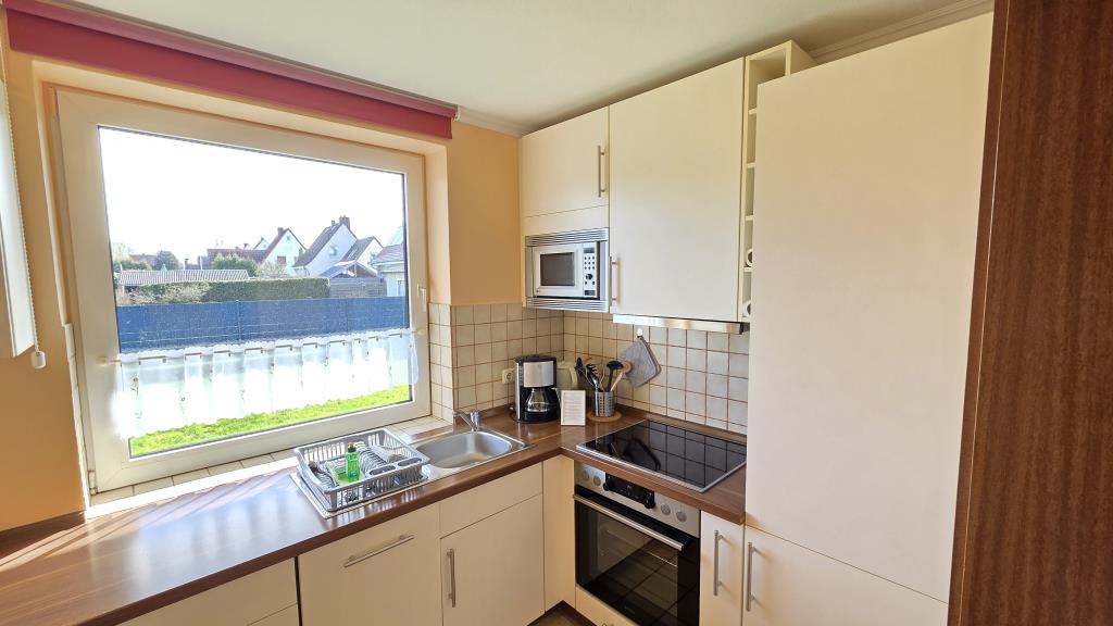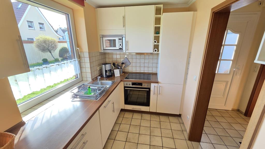 Die Einbauküche mit Spülmaschine, Backofen, Kühlschrank und allen wichtigen Küchenutensilien lädt zum gemeinsamen Kochen ein. Im Duschbad steht Ihnen zusätzlich eine Waschmaschine zur Verfügung – praktisch, besonders für längere Aufenthalte.
