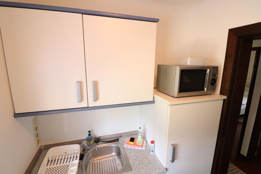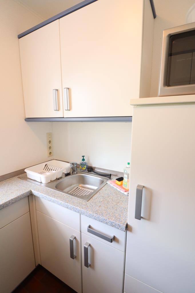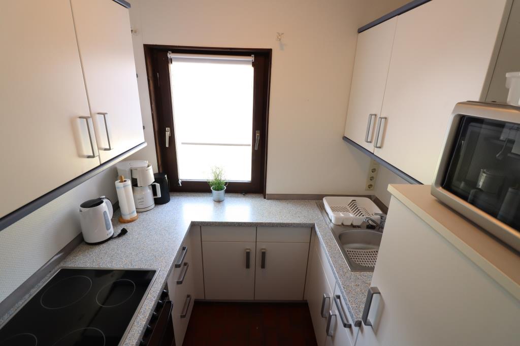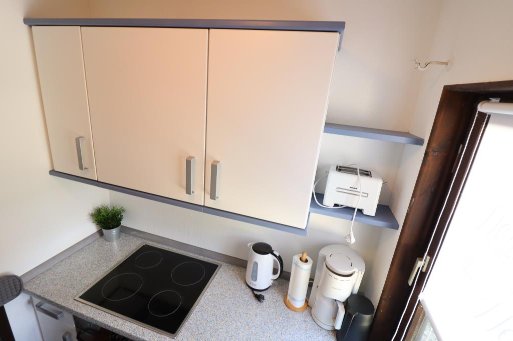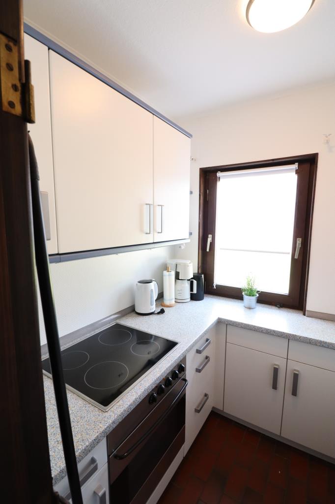 Die separate, kompakte Küche ist voll ausgestattet mit einer Küchenzeile, Backofen, Kühlschrank und Gefrierfach – alles, was Sie benötigen, um Ihre Mahlzeiten ganz nach Ihrem Geschmack zuzubereiten.