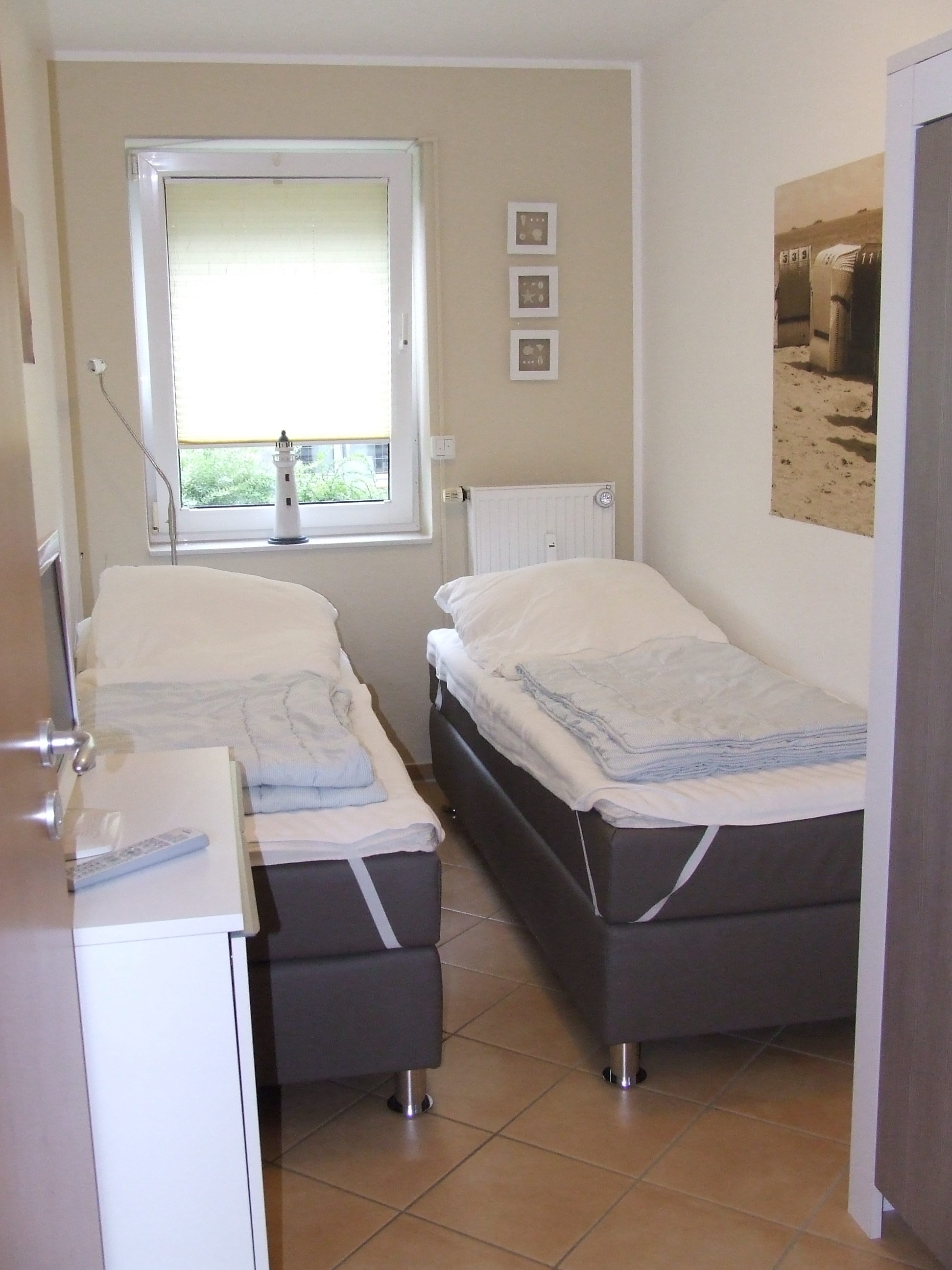 Die beiden Schlafzimmer sind mit einem Doppelbett und einem großen Schrank bzw. zwei Einzelbetten (Boxspringbetten) und einem zweiten Fernseher ausgestattet. Alle Schlafräume sind mit elektr. Rolläden ausgestattet, so dass einem erholsamen Schlaf nichts mehr im Wege steht.