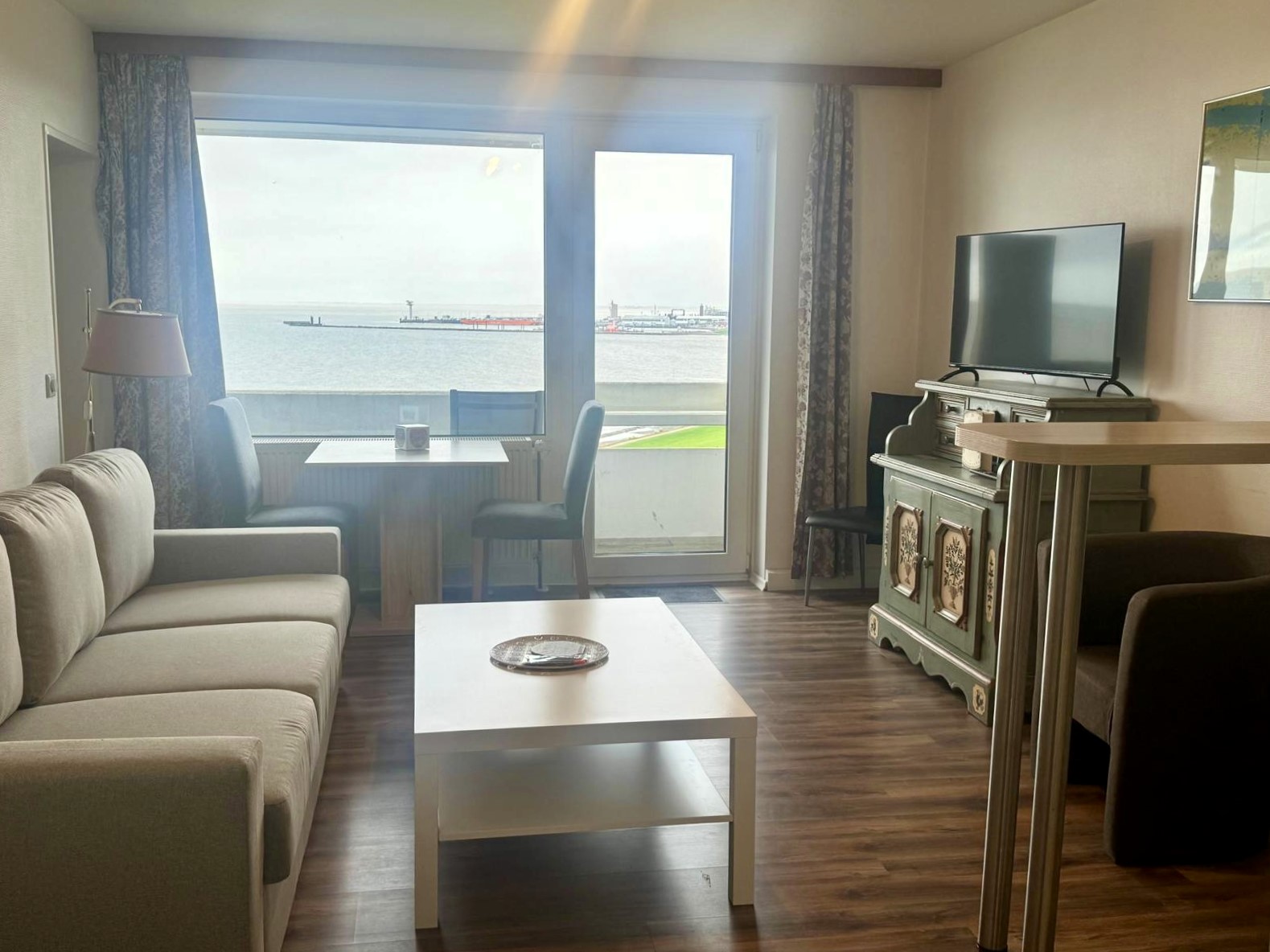 Vom Wohnzimmer aus gelangt man auf den Balkon, auf dem man die Panorama Seesicht mit Blick auf den Weltschiffahrtsweg genießen kann.