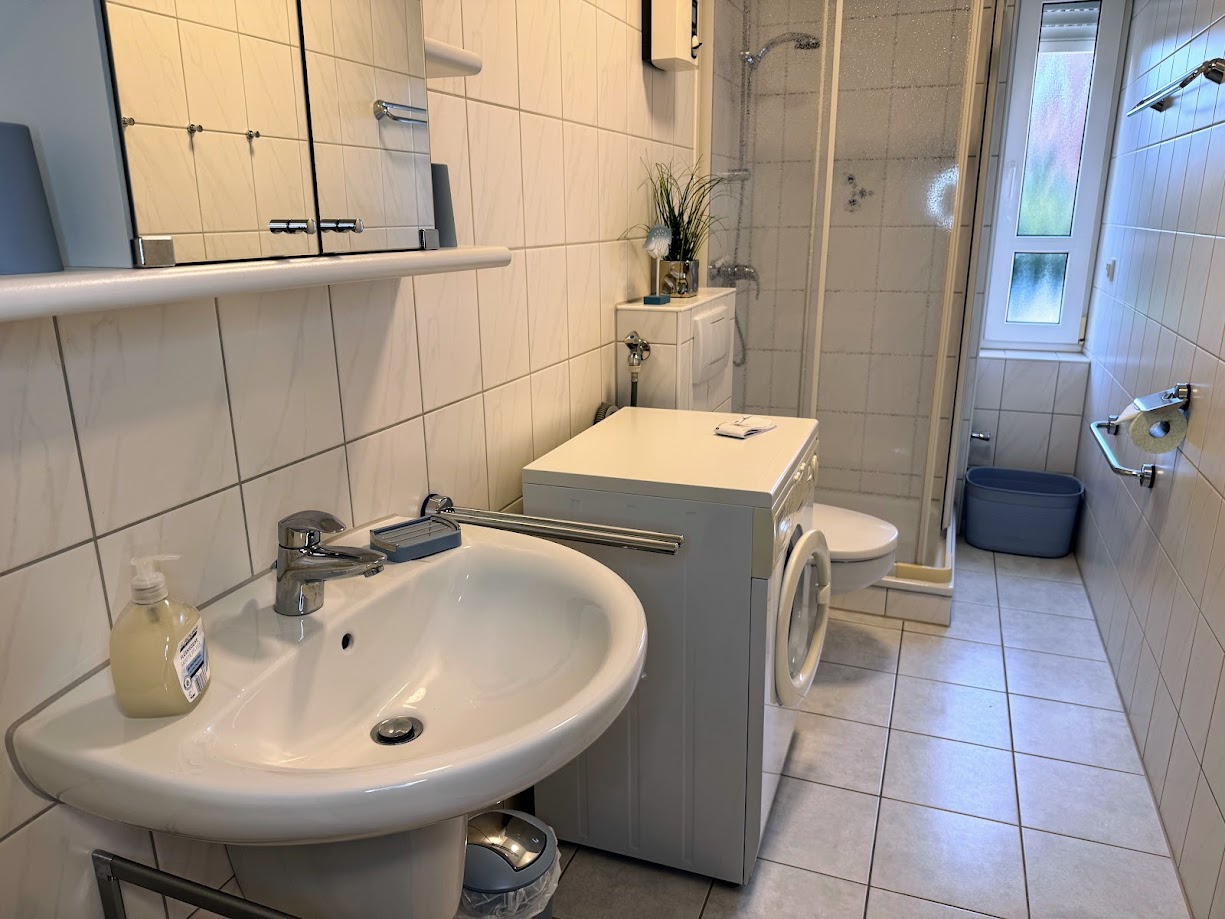 - Südterrasse sowie eigener Gartenanteil mit Gartentisch und Stühlen, Sonnenschirm und Strandkorb - Privater, abschließbarer Geräteschuppen mit Bollerwagen