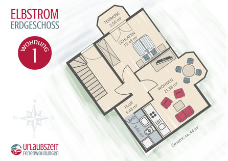 Ferienwohnung im Haus Elbstrom – Strandstraße 63 in Cuxhaven‑Döse Gemütliche 2‑Raum‑Wohnung im Erdgeschoss mit Terrasse, Erker und strandnaher Lage